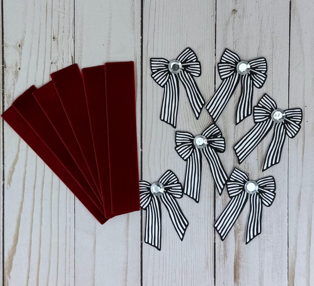 * 6 handmade die cut black and white bows with rhinestones and adhesive.