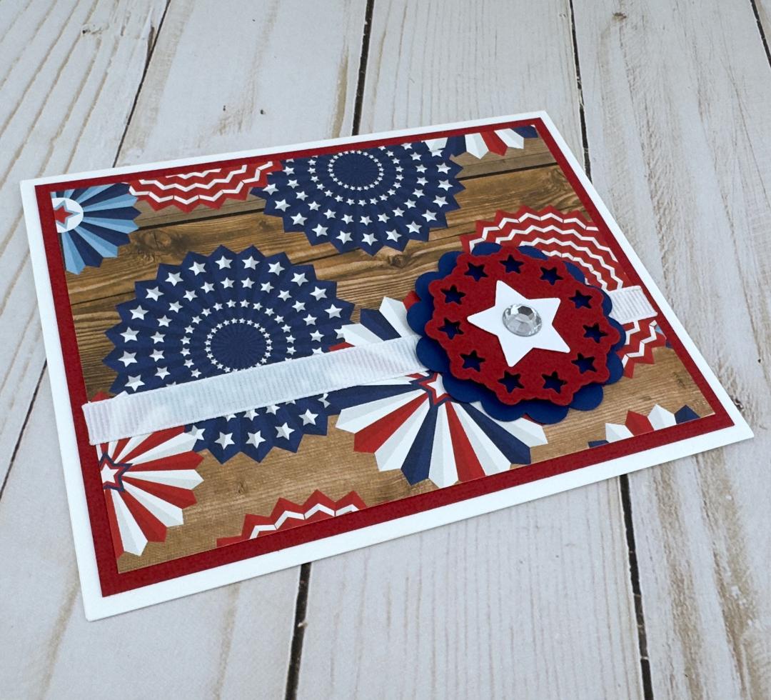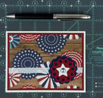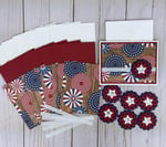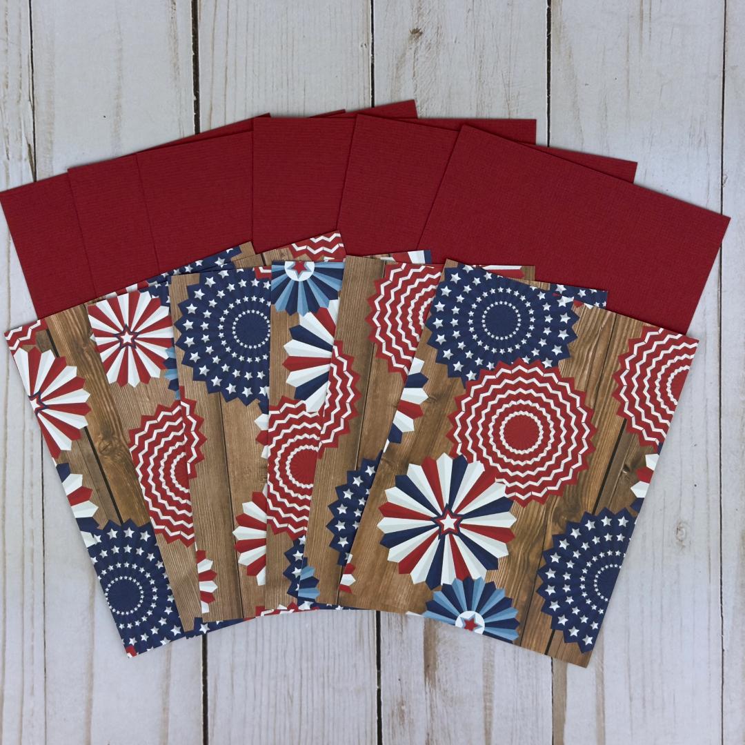 This 4th of July card making kit allows you to create 6 patriotic greeting cards. The patriotic card kit with the colorful bunting print contains all the paper materials and embellishments you need to assemble six A2 cards (4.25 x 5.5 inches), and comes with coordinating envelopes.