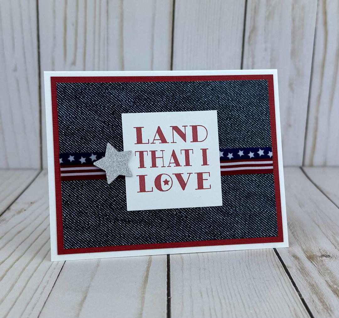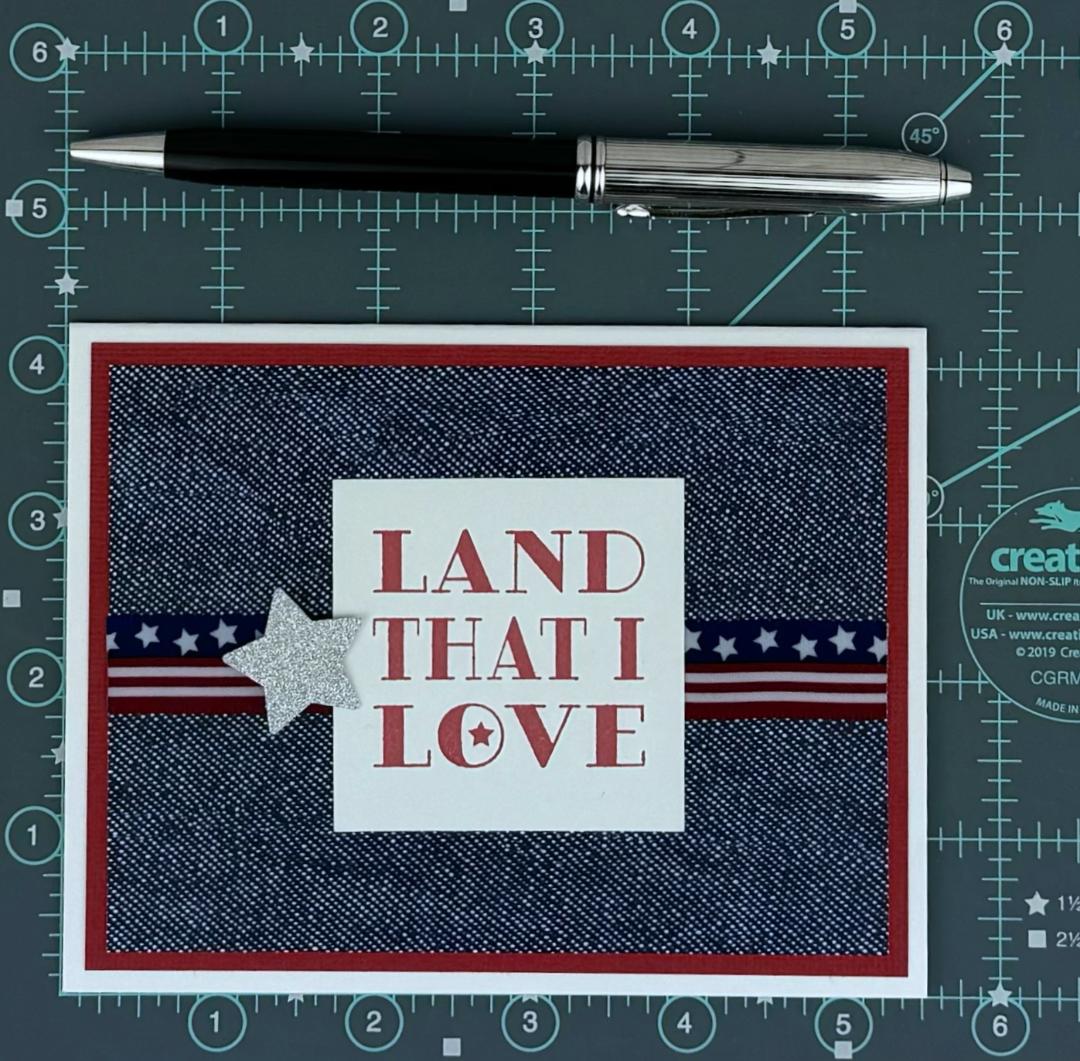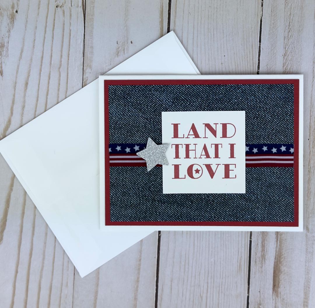 * 6 hand-stamped cardstock pieces with a "Land That I Love" sentiment.