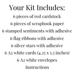 DETAILS: This kit provides all the paper materials and embellishments needed to make six (6) 4th of July cards.