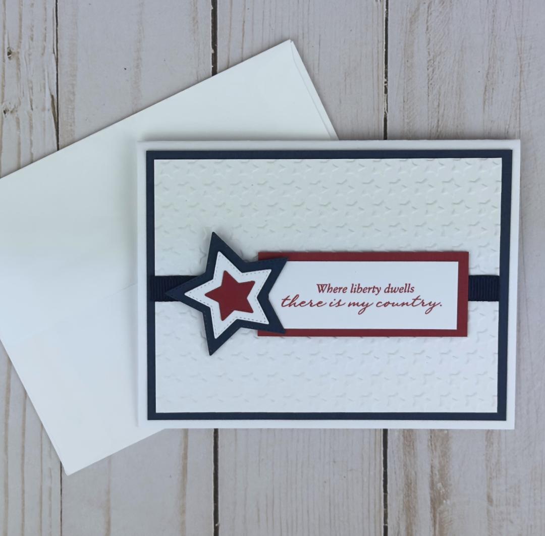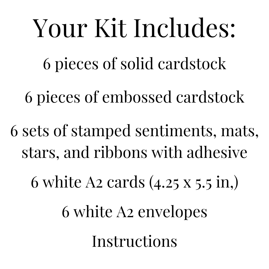 This 4th of July card making kit with star embossed cardstock allows you to create 6 patriotic greeting cards. The Fourth of July papercraft kit contains all the paper materials and embellishments you need to assemble six A2 cards (4.25 x 5.5 inches), and comes with coordinating envelopes.