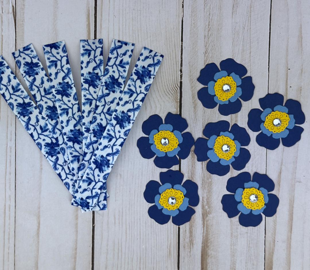 * 6 blue and white floral grosgrain ribbons with double-sided adhesive on the back that have been treated on the ends to prevent fraying.