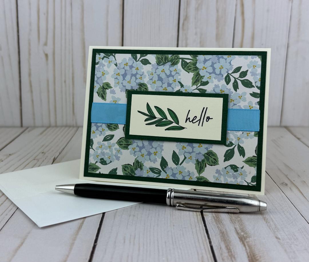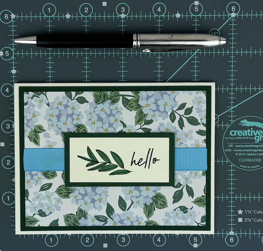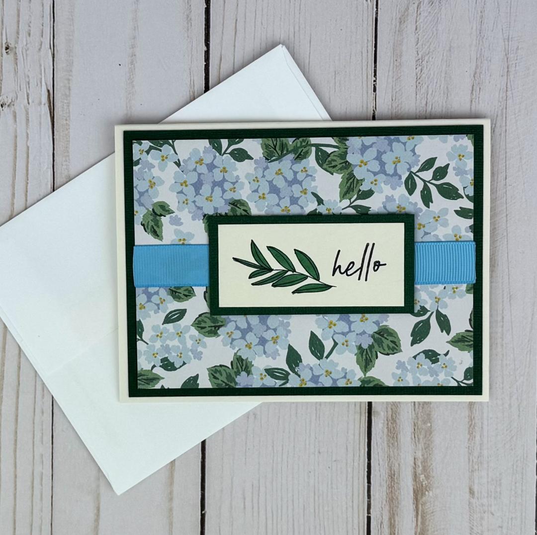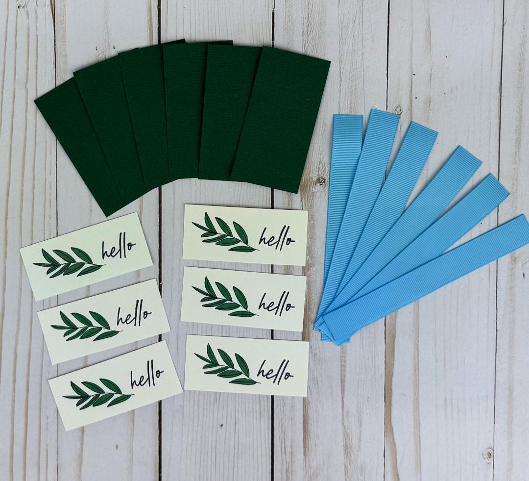 * 6 hand-stamped "Hello" sentiments in black ink with green leaves, with double-sided adhesive.