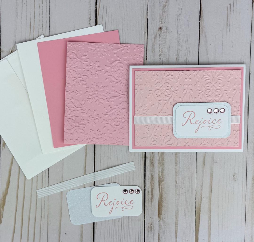 * A stamped "Rejoice" sentiment in pink ink on a white cardstock with three pink rhinestones with adhesive