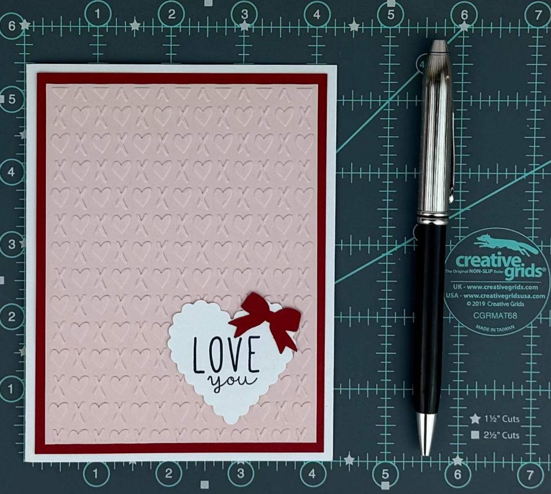 * 12 pieces of "XO" embossed cardstock to serve as the second layer (6 red, 6 pink).