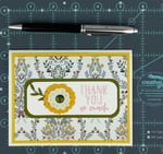 * 6 die cut yellow and off-white flowers with a peridot-colored rhinestone and double-sided adhesive to embellish the front of the card.