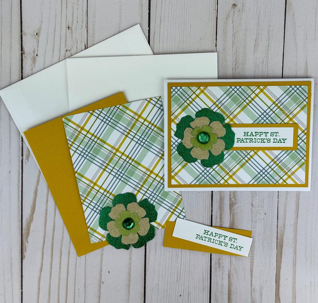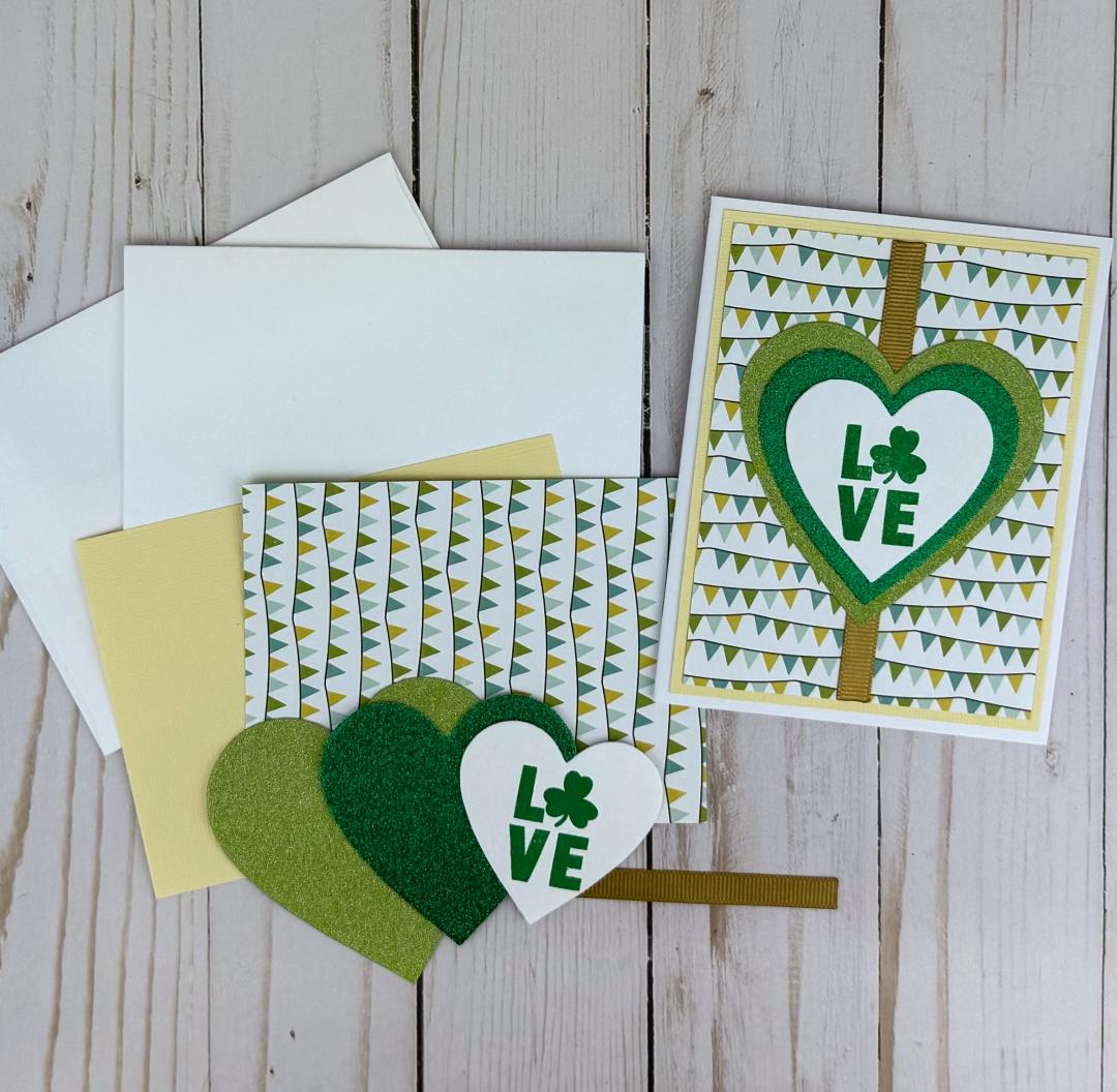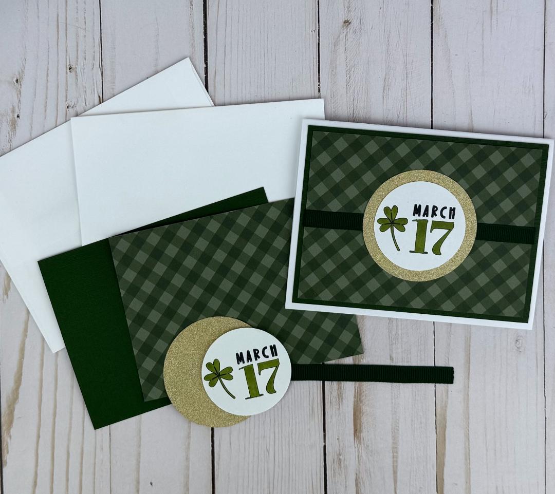 * A stamped "Happy St. Patrick's Day" sentiment on white cardstock in green ink with adhesive.