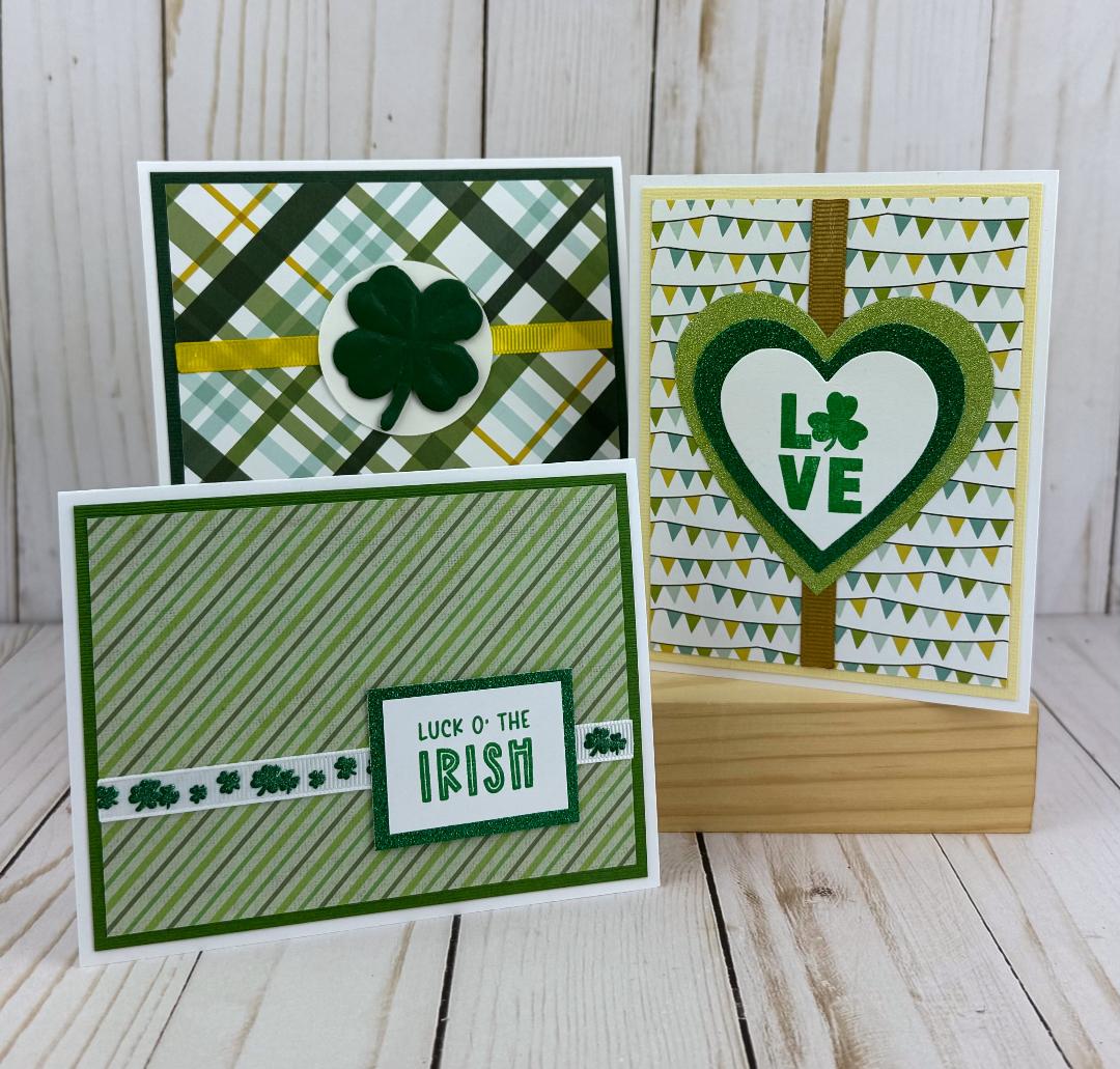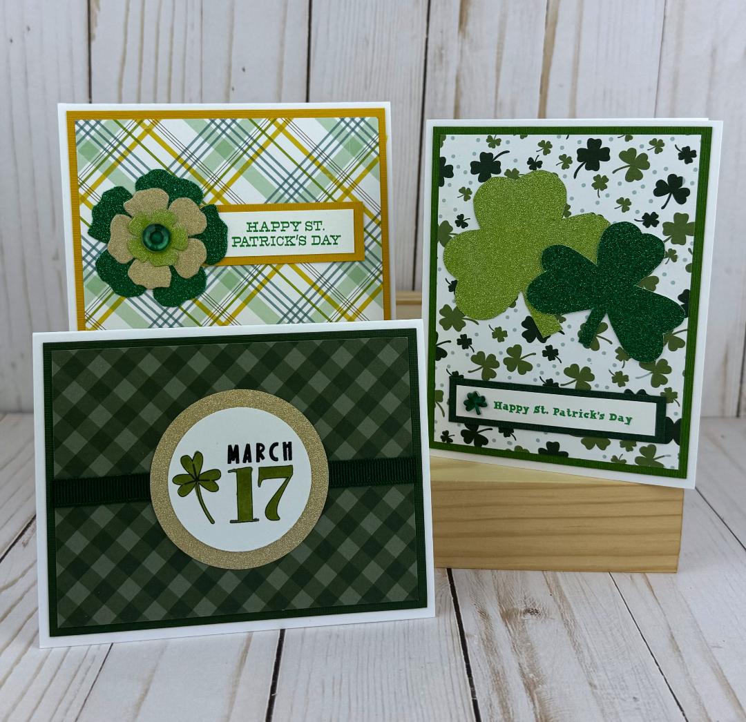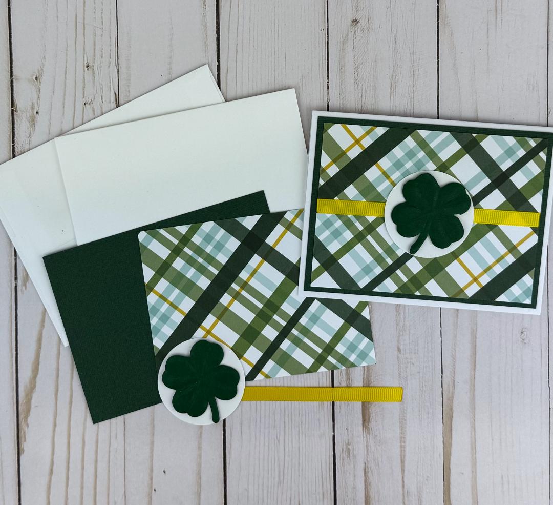 * A stamped "Happy St. Patrick's Day" sentiment on white cardstock in green ink with adhesive.