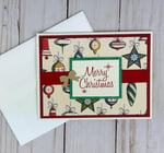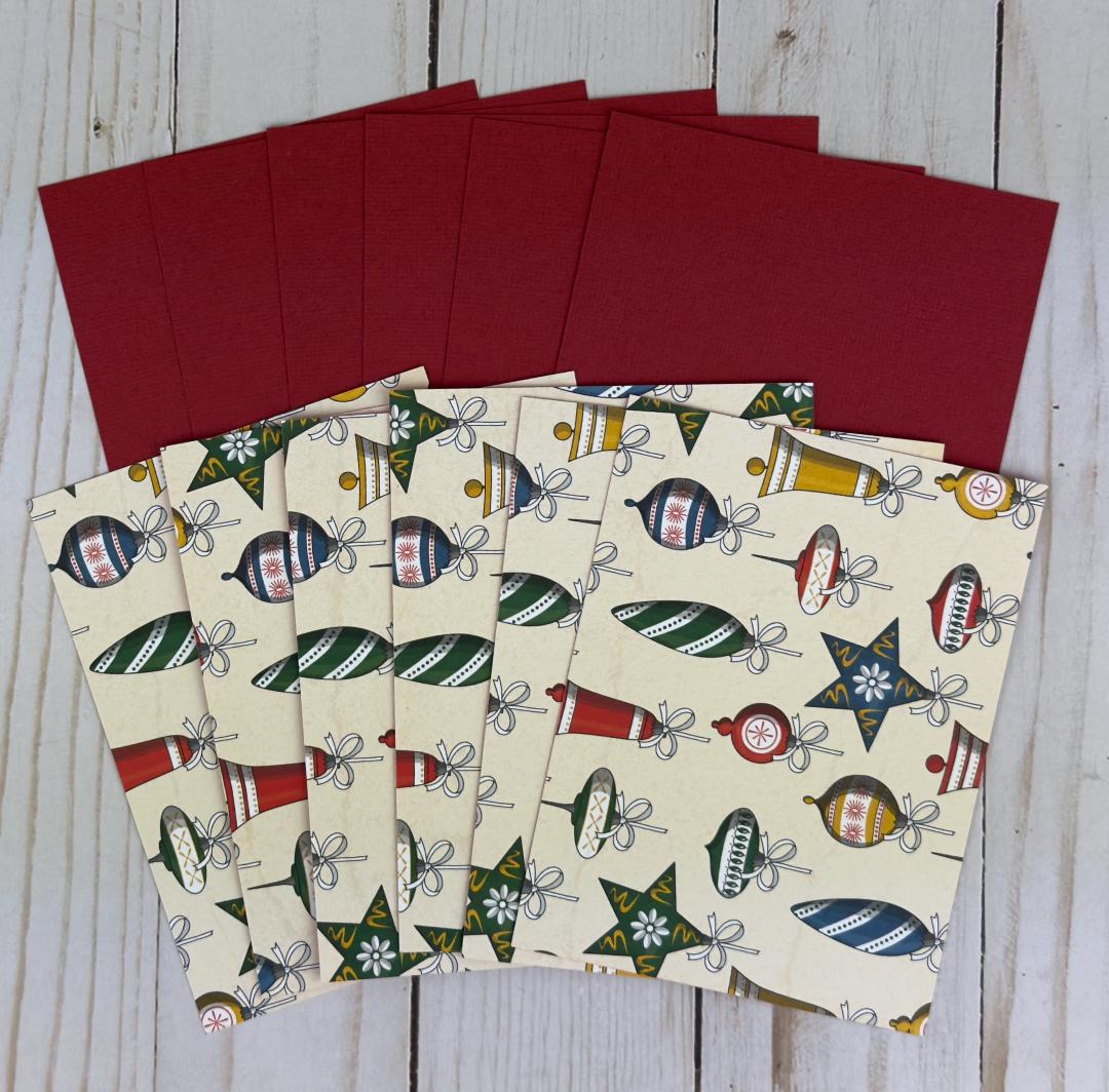 This Merry Christmas card making kit allows you to create 6 retro style greeting cards. The holiday card kit contains all the paper materials and embellishments you need to assemble six A2 cards (4.25 x 5.5 inches), and comes with coordinating envelopes.