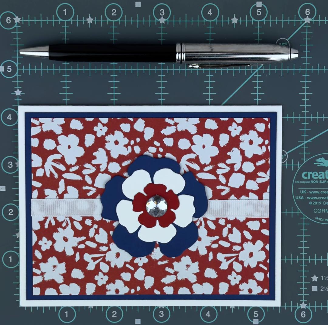 * A red, white and blue die cut cardstock flower with crystal rhinestone embellishment with adhesive