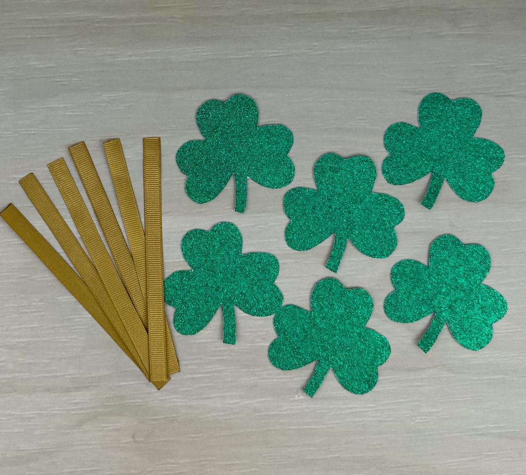* 6 hand-stenciled and hand-cut green glitter shamrocks with adhesive