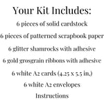 This St. Patrick's Day card kit allows you to create 6 festive cards. The DIY card kit contains all the paper materials you need to assemble six A2 cards (4.25 x 5.5 inches), and comes with coordinating envelopes.