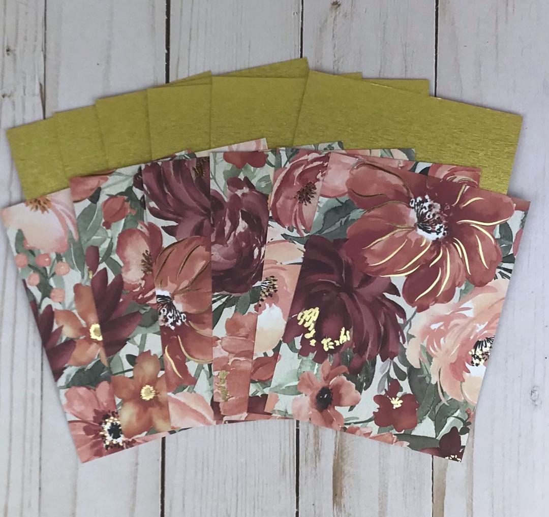 * 6 pieces of floral patterned paper with gold foil accents to serve as the second layer.