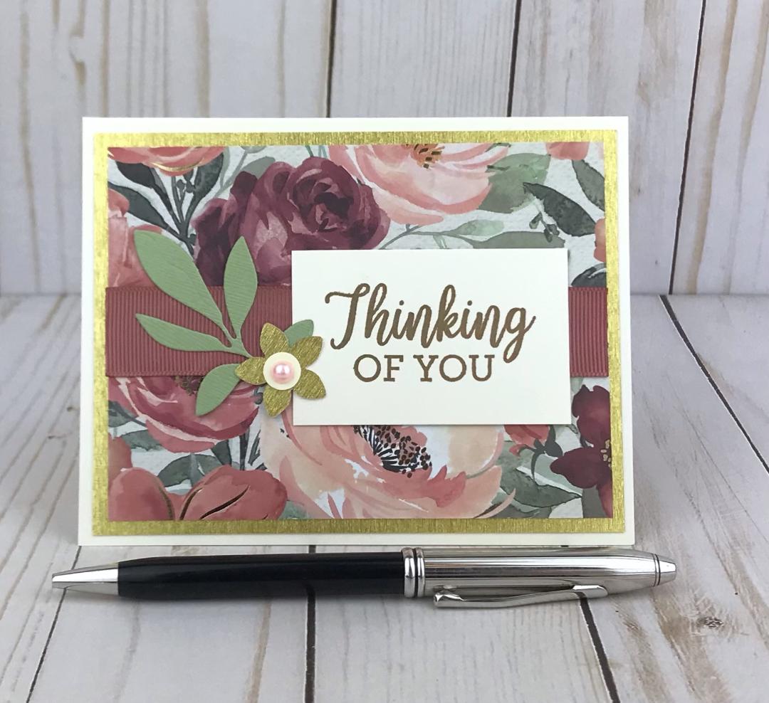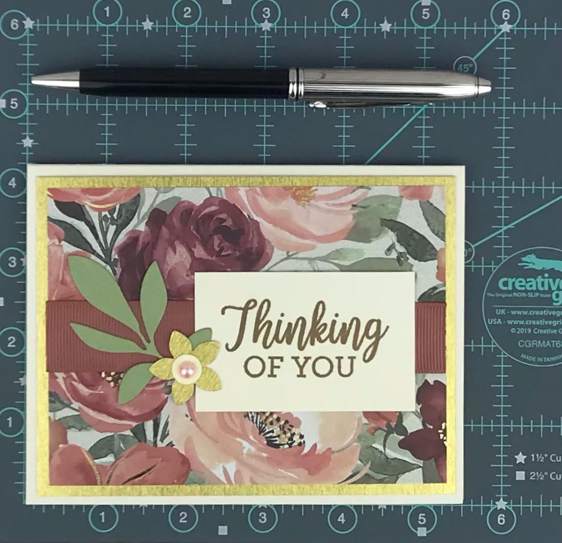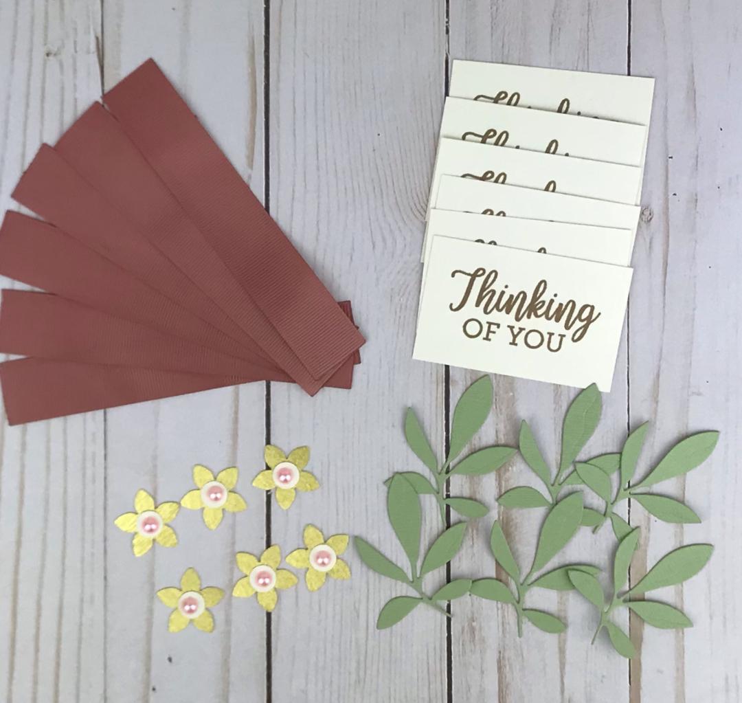 * 6 hand-stamped "Thinking of You" sentiments in brown ink on off-white cardstock.